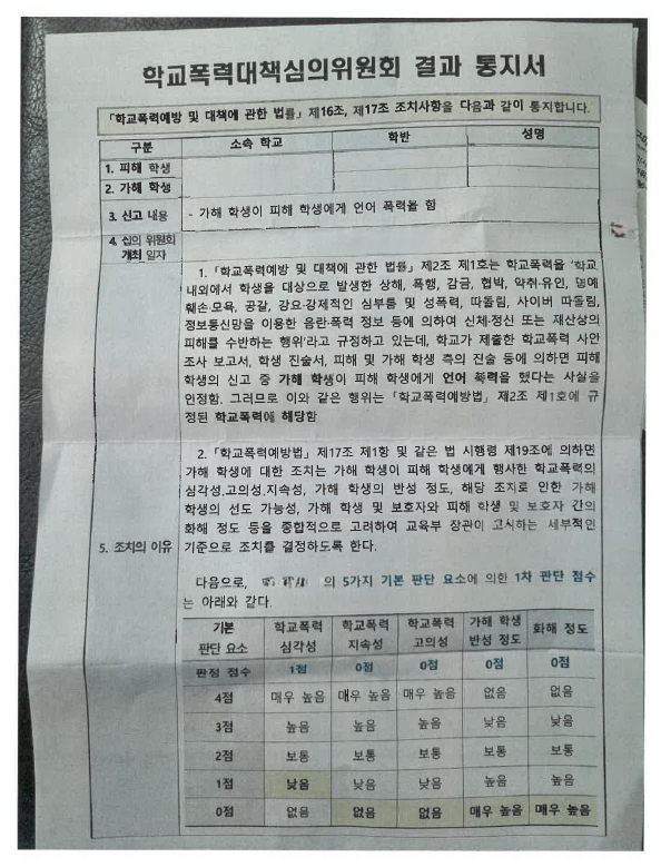 재발 가능성이 낮은 점을 종합적으로 고려하여1호 처분(서면사과) 만을 의결하였습니다.(학폭처분결과통지서 첨부)