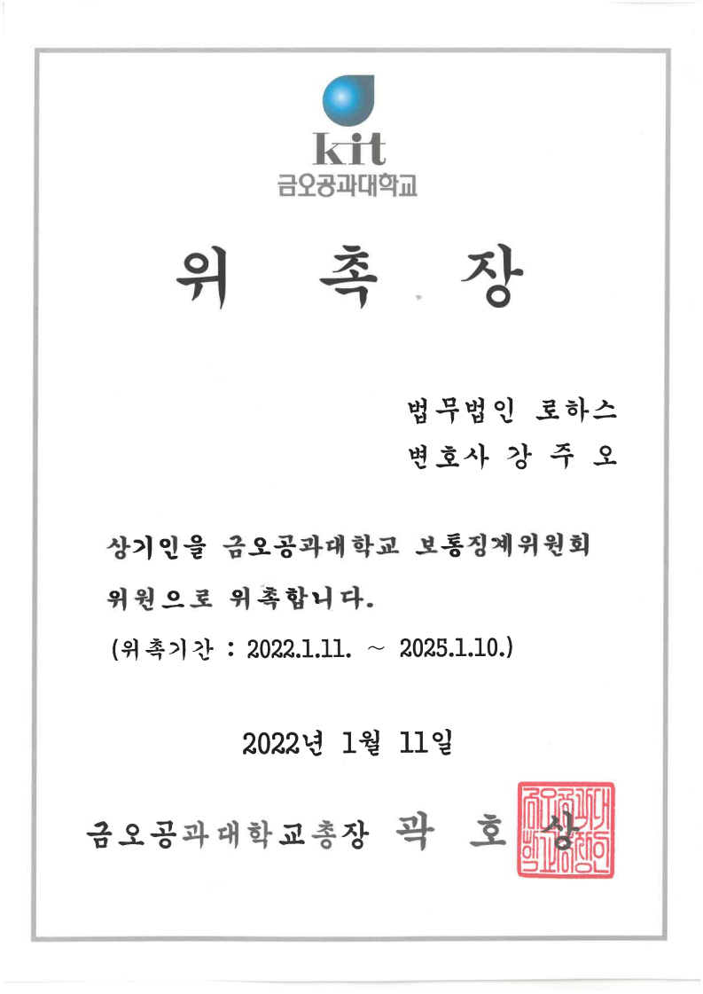 [강주오 대표 변호사] 금오공과대학교 보통징계위원회 위원 위촉