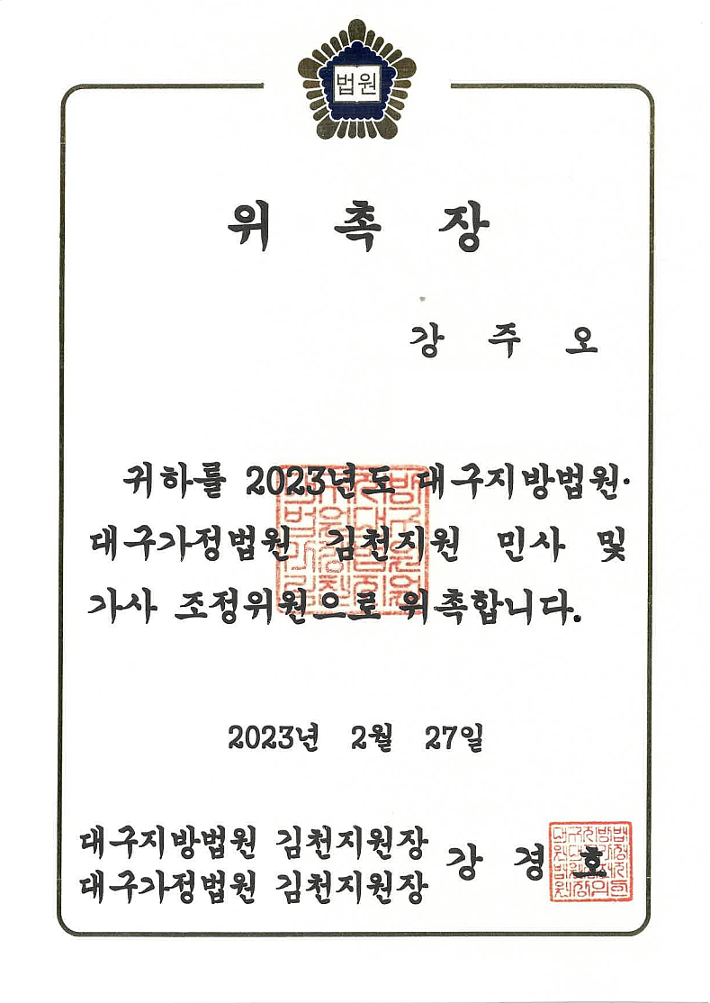 [강주오 대표 변호사] 2023년도 대구지방법원·대구가정법원 김천지원 민사 및 가사 조정위원 위촉