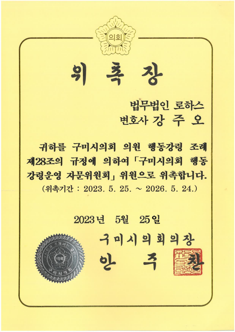[강주오 대표 변호사] 구미시의회 행동강령운영 자문위원회 위원 위촉