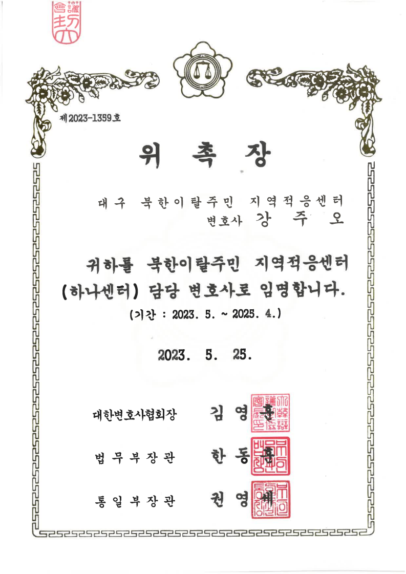 [강주오 대표 변호사] 하나센터 담당 변호사 임명