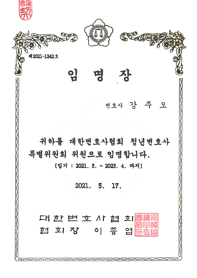 [강주오 대표 변호사] 대한변협 청년변호사 특별위원회 위원 임명