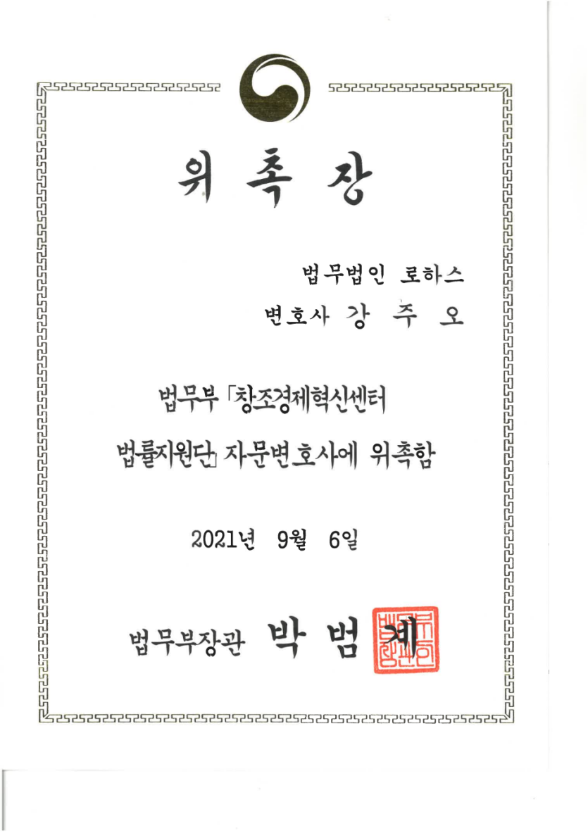 [강주오 대표 변호사] 창조경제혁신센터 법률지원단 자문변호사 위촉