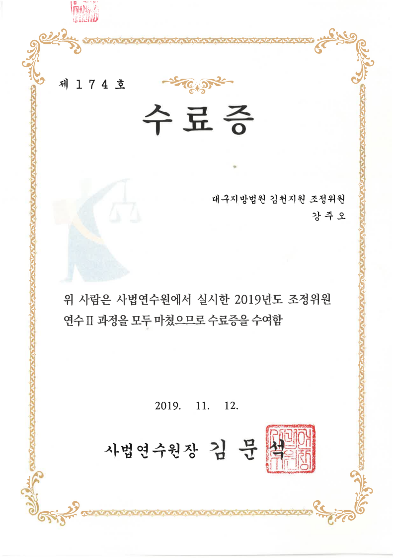 [강주오 대표 변호사] 사법연수원 실시, 2019년도 조정위원 연수Ⅱ과정 수료