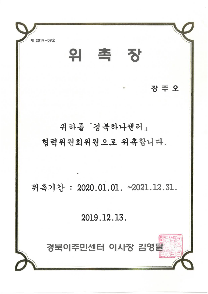 [강주오 대표 변호사] 경북하나센터 협력위원회위원 위촉