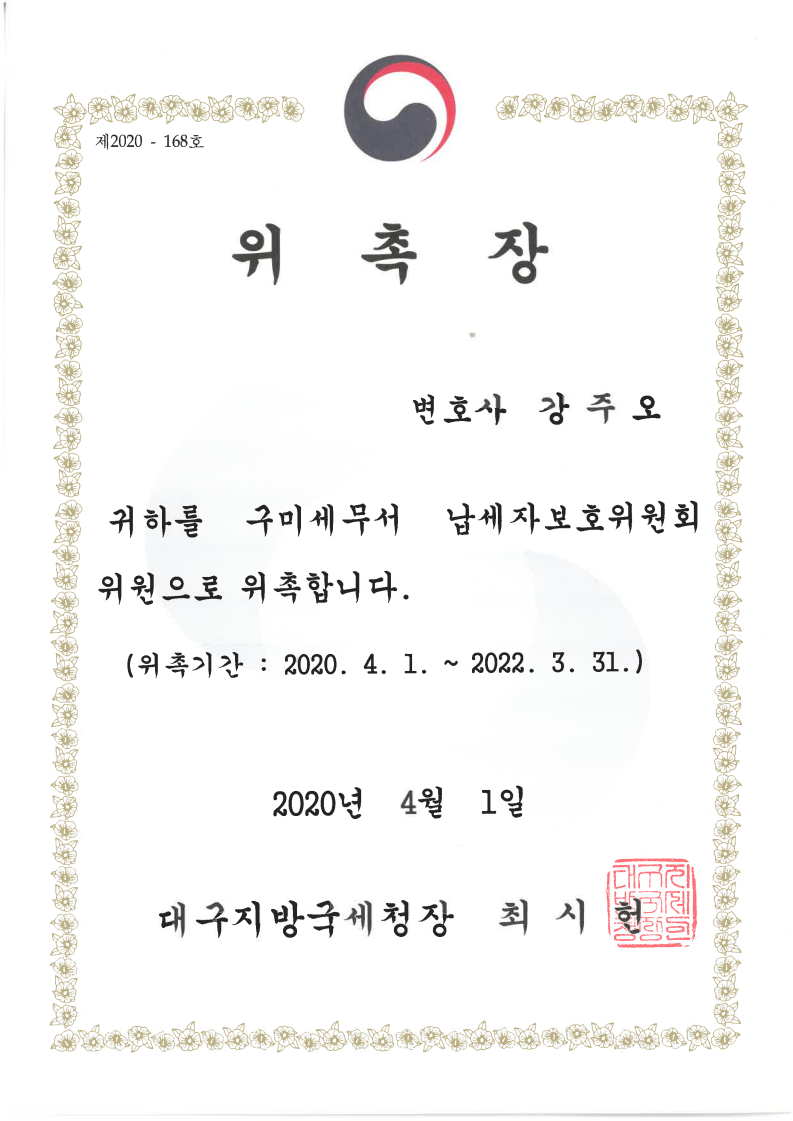 [강주오 대표 변호사] 구미세무서 납세자보호위원회 위원 위촉