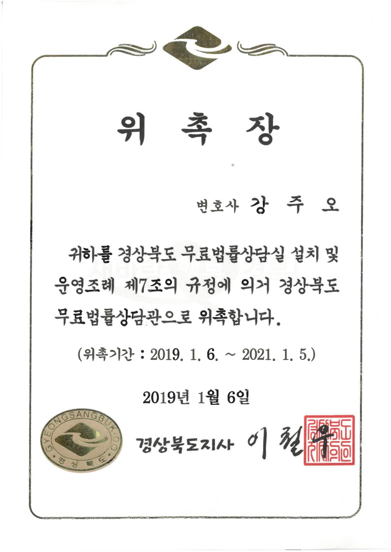 [강주오 대표 변호사] 경상북도 무료법률상담관 위촉