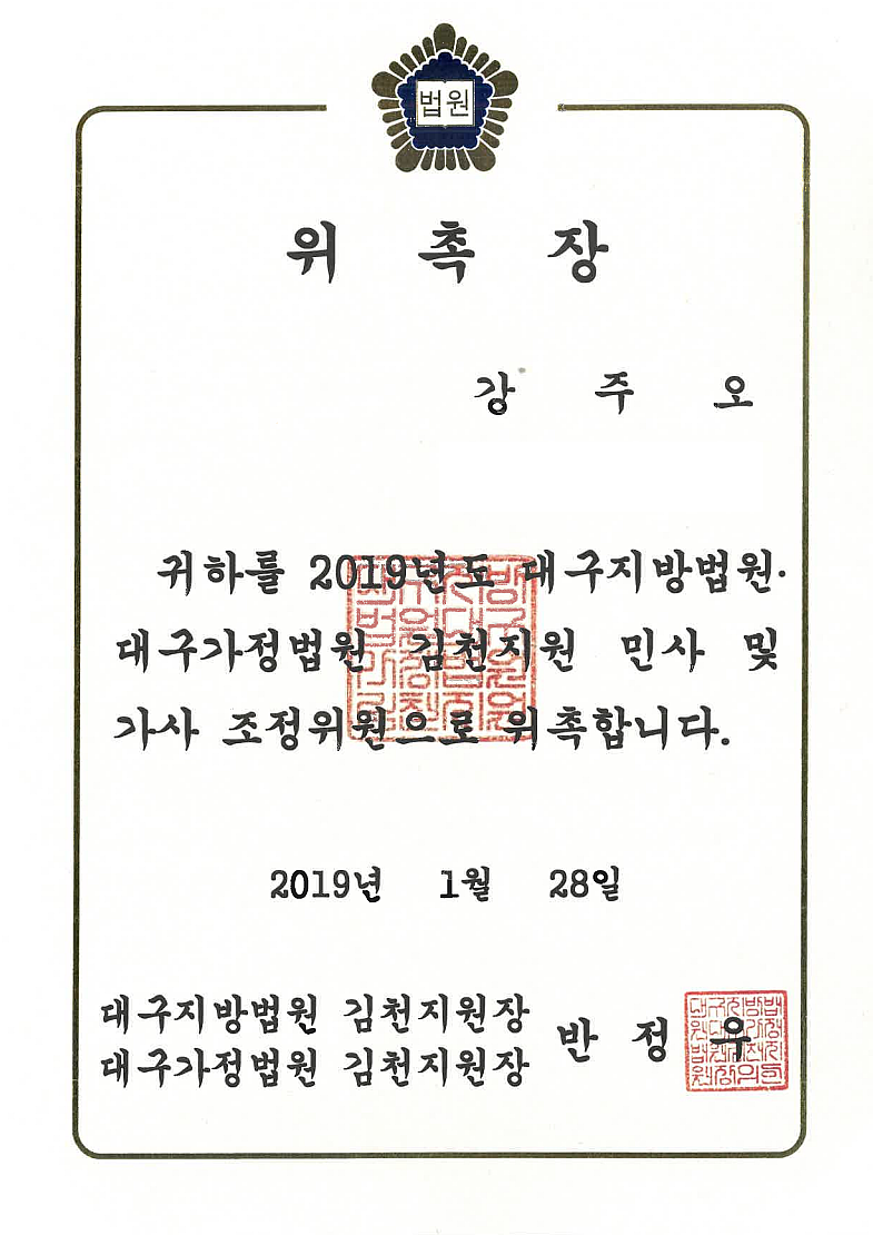 [강주오 대표 변호사] 2019년도 대구지방법원·대구가정법원 김천지원 민사 및 가사 조정위원 위촉