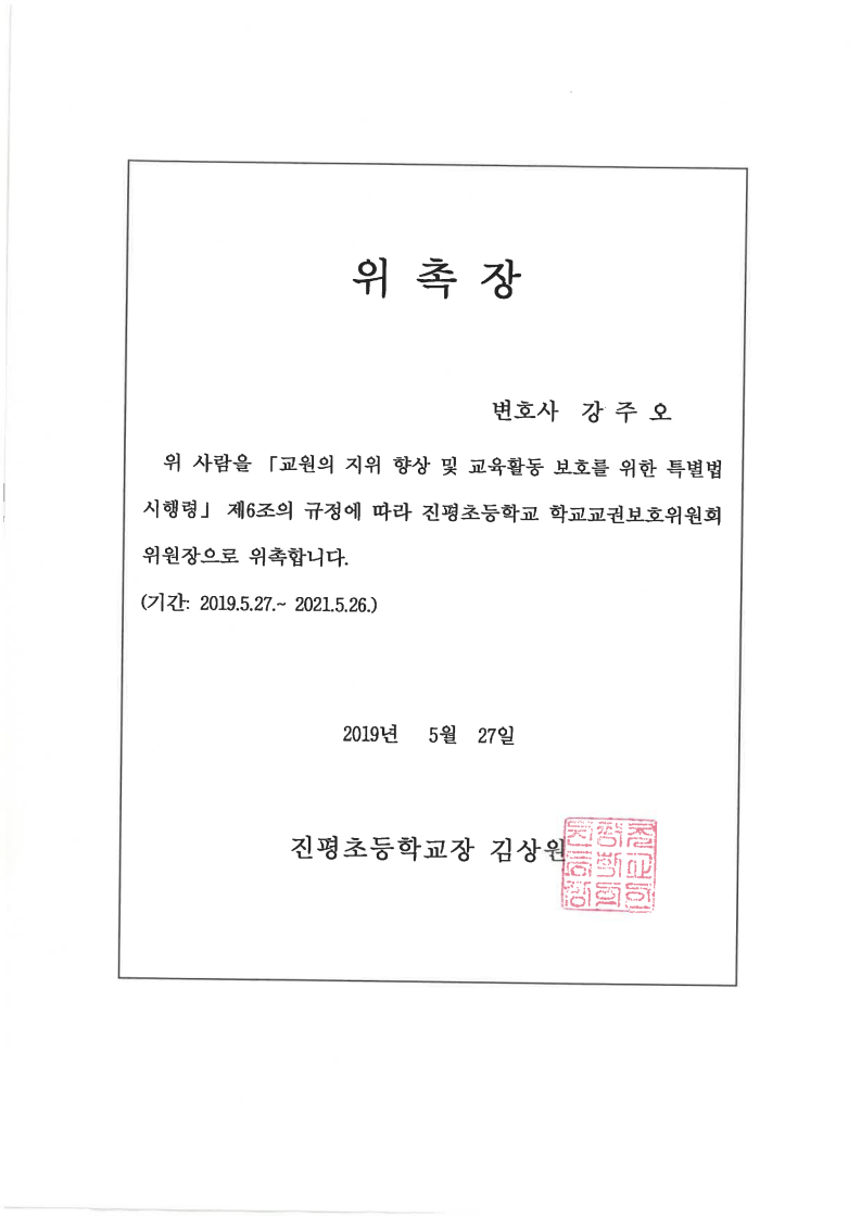 [강주오 대표 변호사] 진평초등학교 교권보호위원회 위원장 위촉