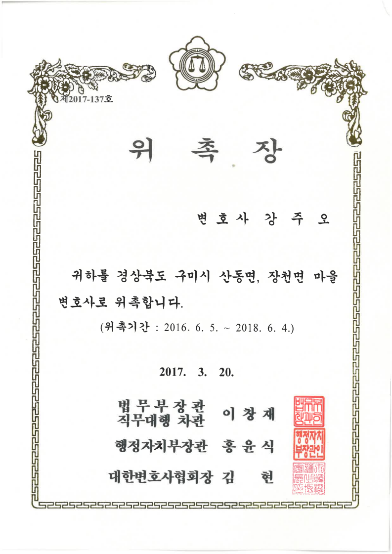 [강주오 대표 변호사] 경북 구미시 산동면, 장천면 마을 변호사 위촉