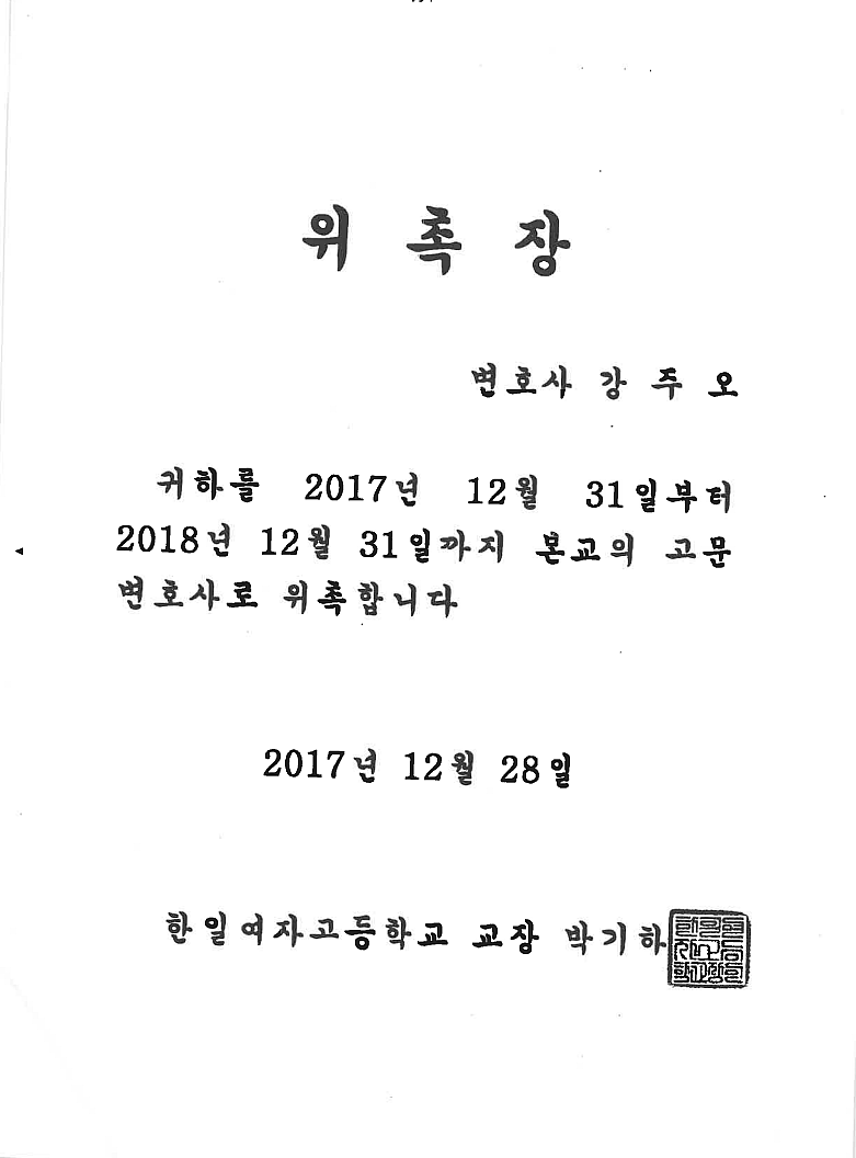 [강주오 대표 변호사] 한일여자고등학교 고문 변호사 위촉