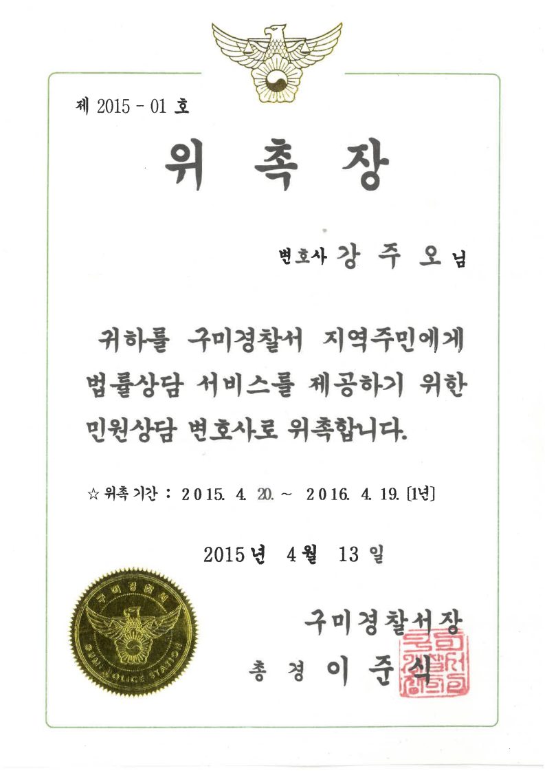 [강주오 대표 변호사]구미경찰서 민원상담 변호사로 위촉되었습니다.