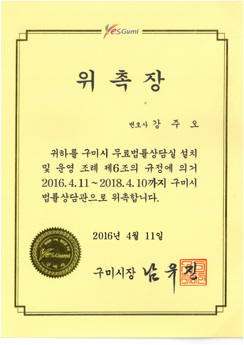 [강주오 대표 변호사] 구미시 무료법률상담관 위촉