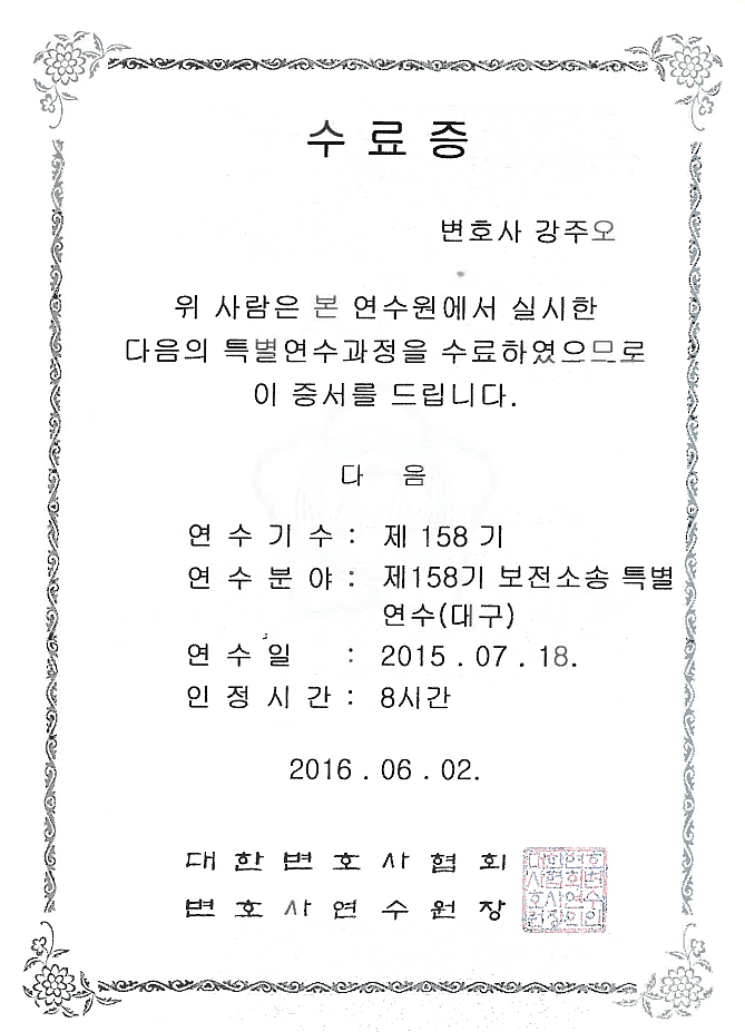 [강주오 대표 변호사] 대한변협 제158기 보전소송 특별연수 수료