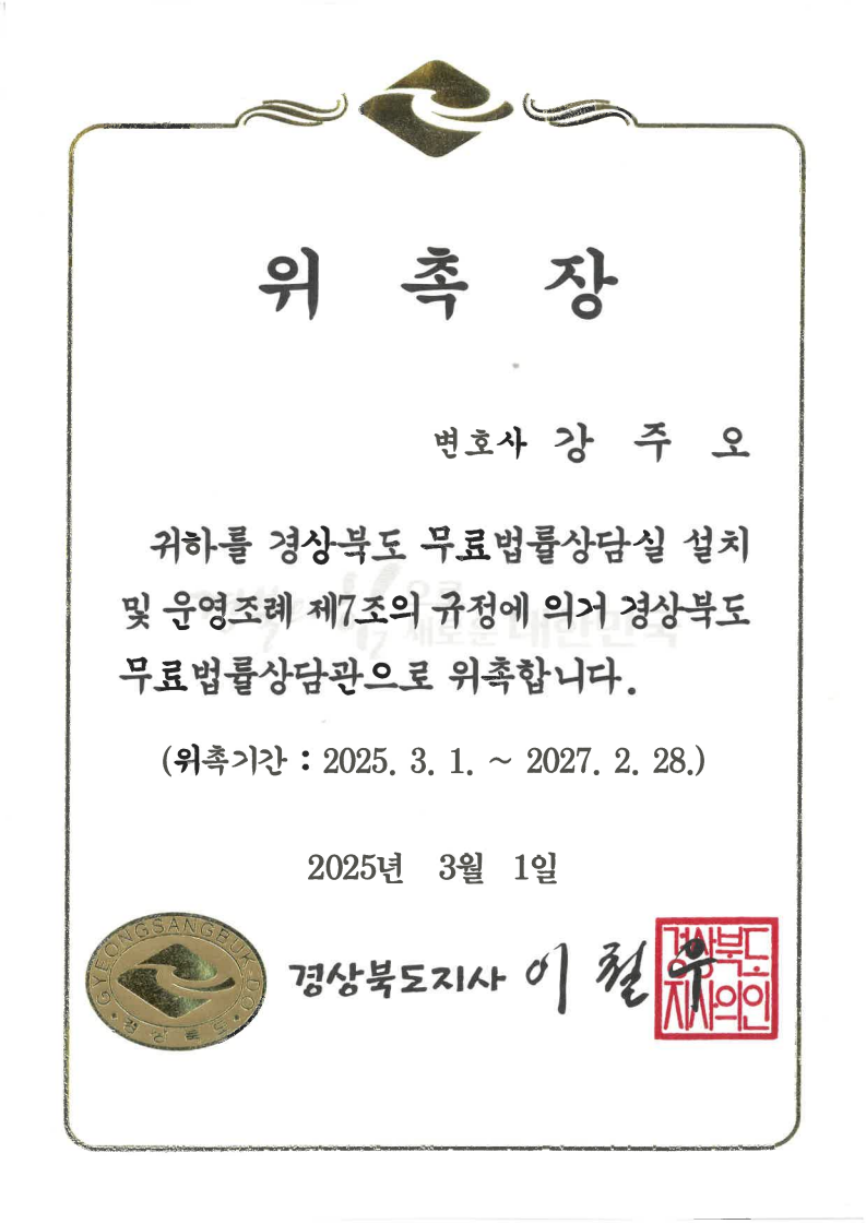 [강주오 대표 변호사] 경상북도 무료법률상담관 위촉