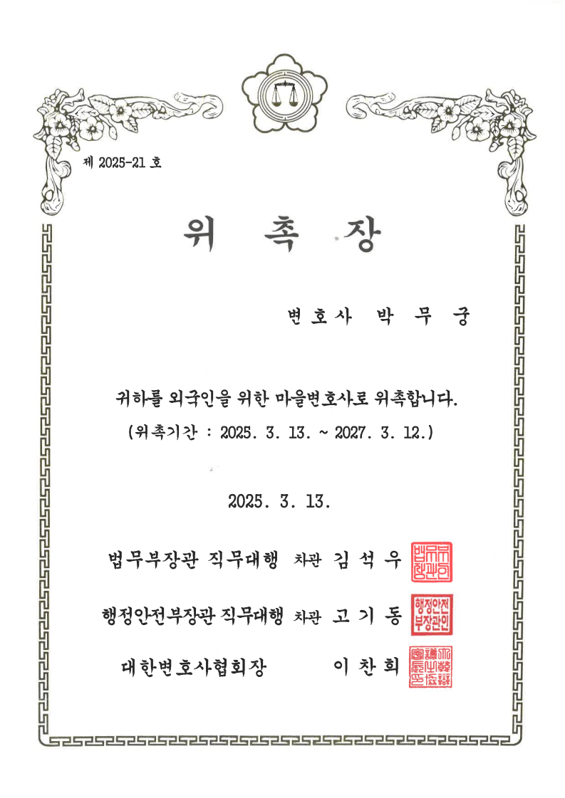 [박무궁 책임 변호사] 외국인 마을변호사 위촉