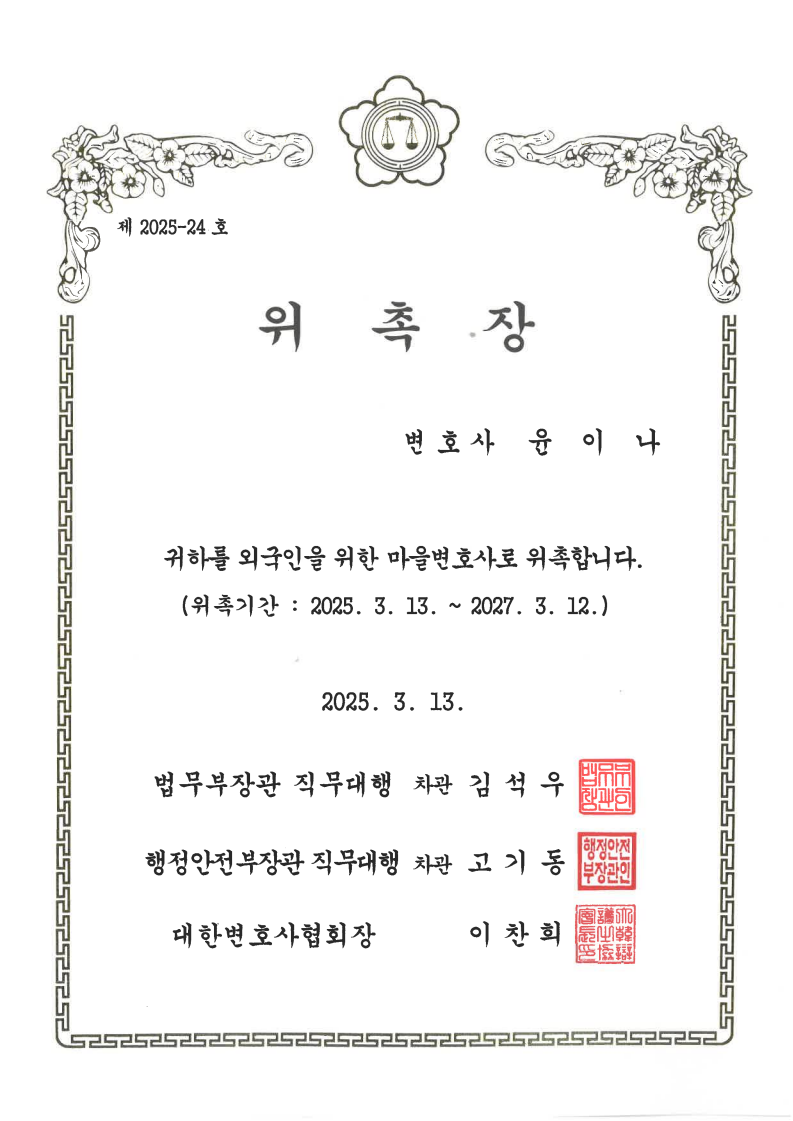 [윤이나 변호사] 외국인 마을변호사 위촉