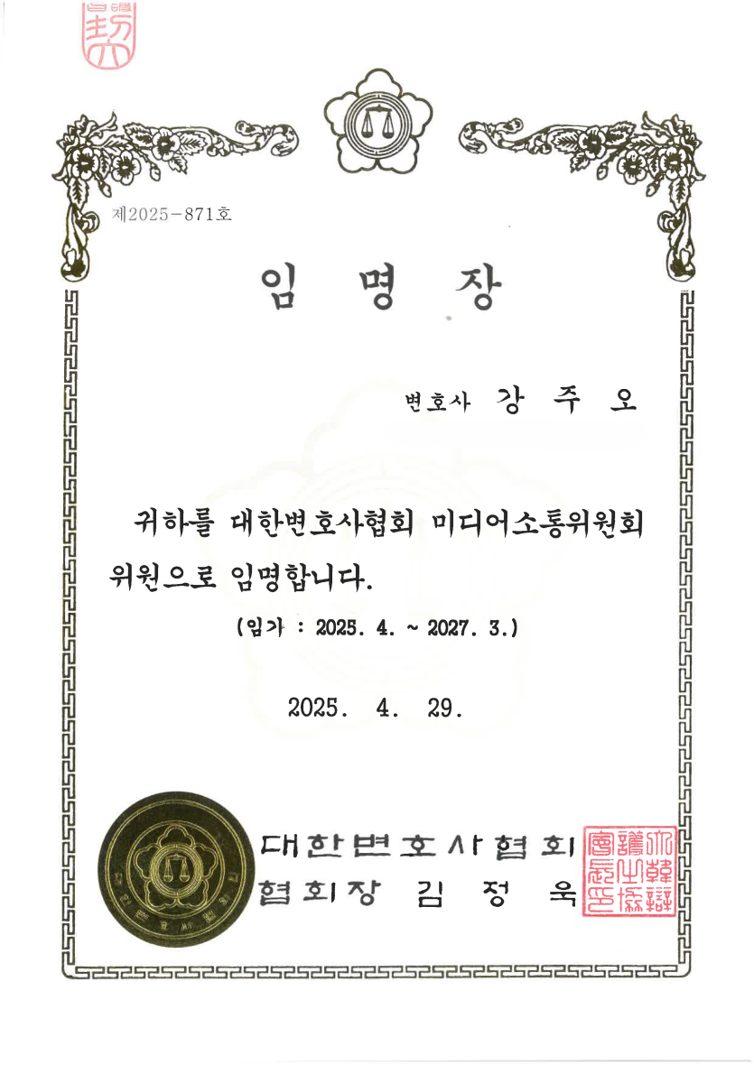 [강주오 대표 변호사] 대한변호사협회 미디어소통위원회 위원 임명