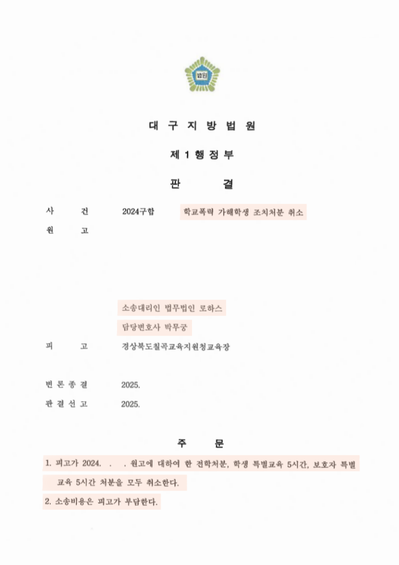 결국 법원은 법무법인 로하스의 주장을 받아들여, 의뢰인에 대한 전학처분을 모두 취소하라는 판결을 선고하였고, 이 판결은 최종 확정되어 의뢰인의 자녀는 부당한 전학 없이 학교생활을 계속 이어갈 수 있게 되었습니다.