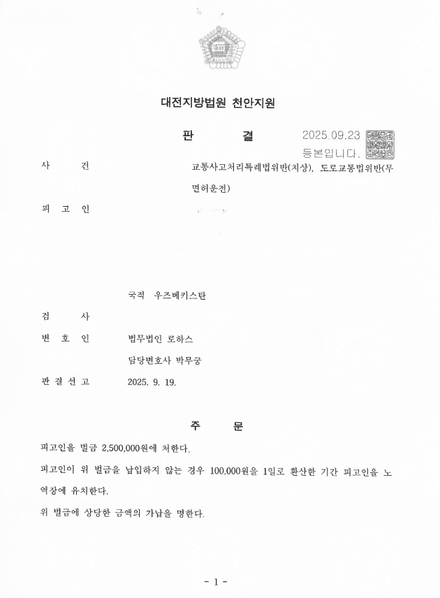 교통사고처리특례법위반(치상), 도로교통법위반(무면허운전) 사건, 12대 중과실에서 벌금 250만 원 선고 사례(외국인 사건)