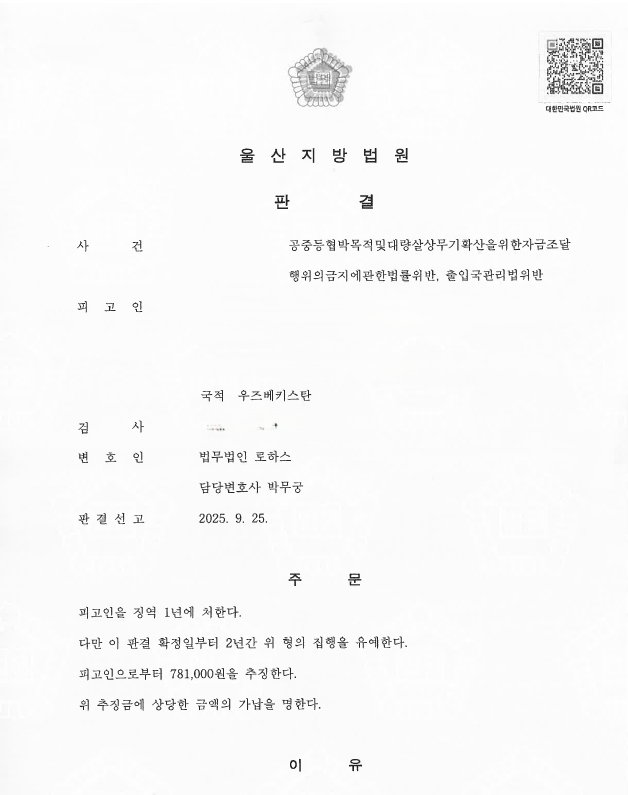 법원은 테러단체에 자금을 제공하는 행위는 인간의 존엄성을 훼손하는 범죄를 꾀하고 이를 실행하는 테러단체의 존속을 돕는 것으로서 엄하게 처벌하여야 할 필요가 있다며, 피고인에 대하여 징역 1년, 집행유예 2년을 선고하였습니다.