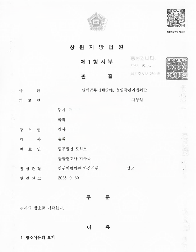 위 사건과 같이 국가기관에 대한 공무집행방해죄, 출입국관리법 위반 등 행위로 기소될 경우 무죄판결을 받는 경우를 찾기가 어렵다는 점에서, 의미 있는 결과입니다.