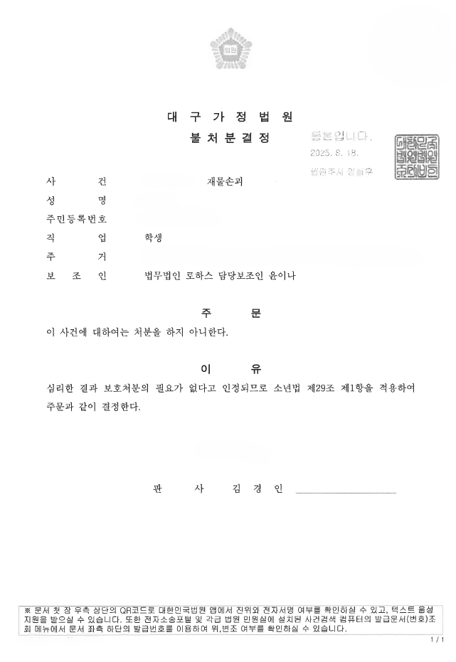 소년보호 불처분 결정(보호처분 없음) 을 내렸습니다.